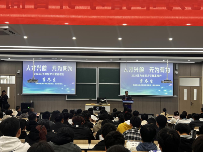 李冬生在宣讲推介活动上致辞,对陈兆强一行来校开展招才引智活动表示欢迎,向无为市一直以来对我校毕业生就业创业工作的大力支持表示衷心感谢。他指出,我校与无为市联系紧密,交流合作深入推进。学校始终把人才培养作为办学的根本任务,建校41年来,涌现了一大批建功立业的精英翘楚;无为市致力于打造人才发展的优质环境,通过精准引才、专业育才、温情留才的策略,不断优化人才政策和完善人才服务体系。他表示今天的宣讲活动,一定能让双方在校地合作和产教融合中擦出靓丽火花、取得丰硕成果,一定能让广大学子感受到无为尊才爱才用才惜才的满满诚意。
