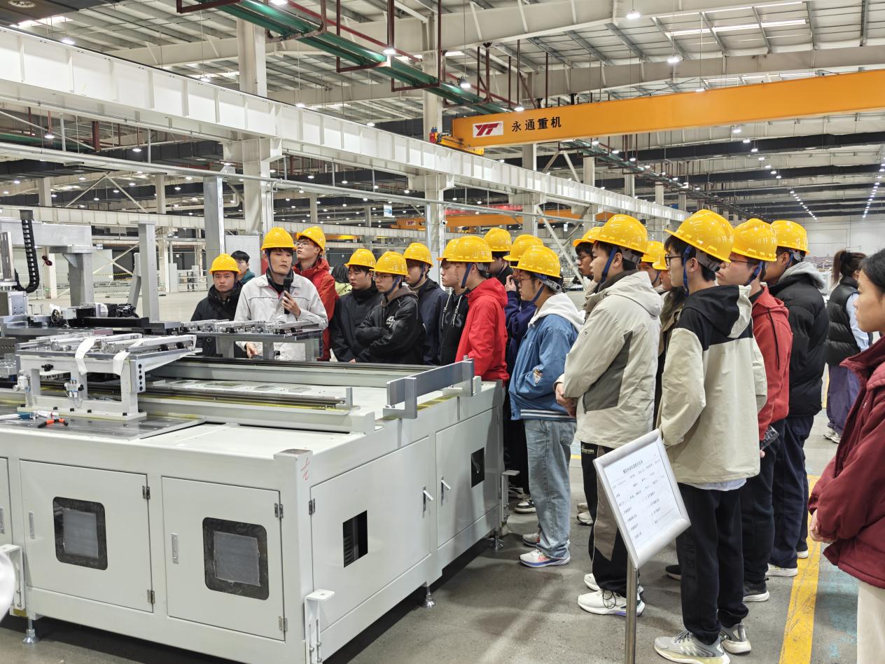 在姚科长的带领下,师生们先后参观了比亚迪电池生产产线及设备制造产线。通过近距离观摩自动化生产流程、先进制造设备及精密加工工艺,同学们直观感受了龙头企业的生产运营模式与技术实力,对新能源汽车及电池制造领域的行业发展现状有了更为清晰的认知。期间,姚科长结合产线实际,详细介绍了比亚迪的发展历程、核心业务布局、主要产品体系及未来战略规划,让同学们深入了解了企业的发展潜力与行业竞争力,进一步明晰了自身专业与岗位的适配方向。