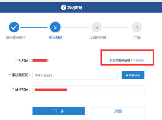 查看左侧手机号是否正确,如正确直接获取验证码修改登录密码,如不正确点击手机号暂停使用?申请修改。